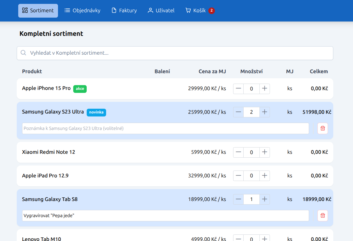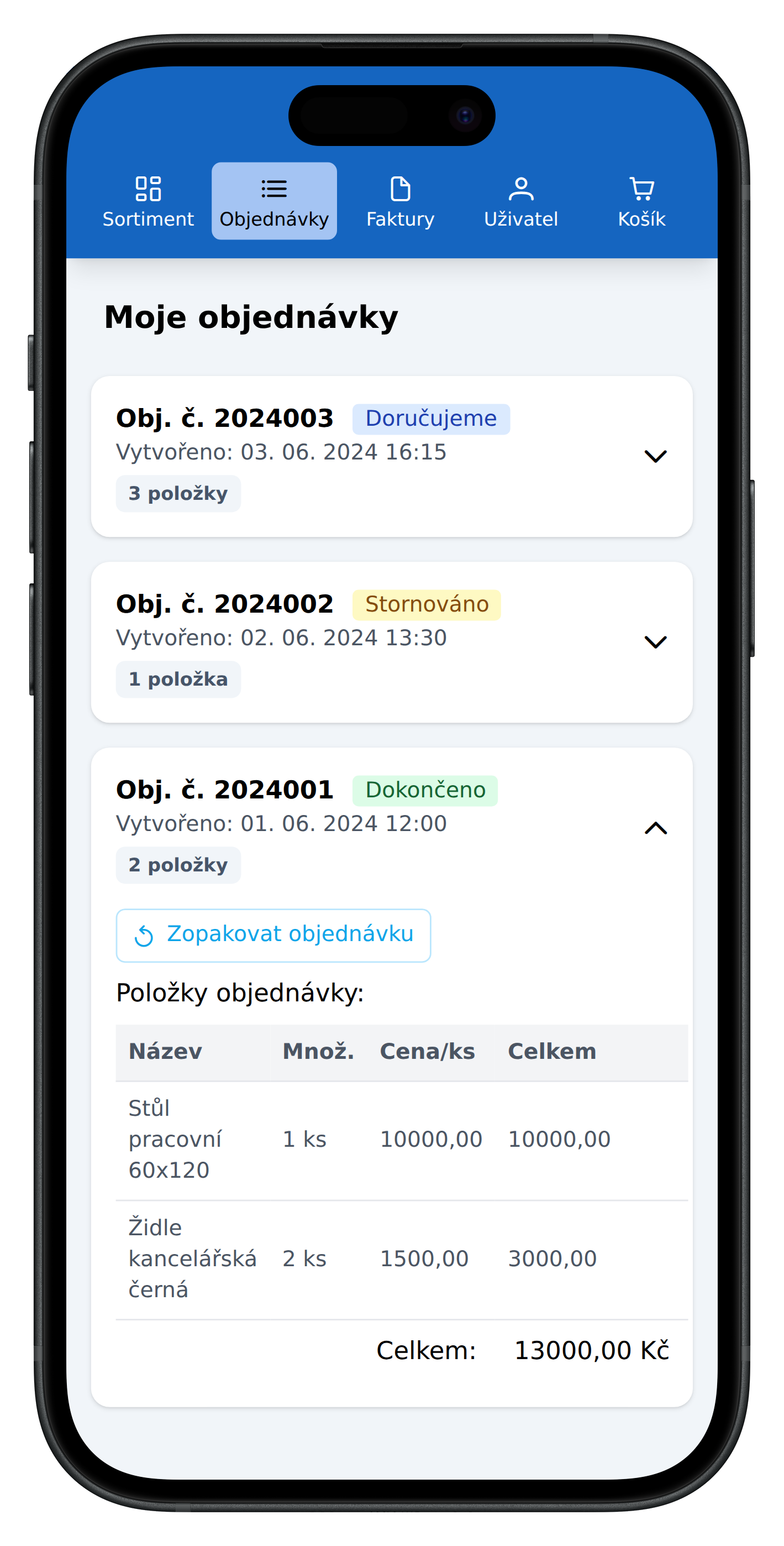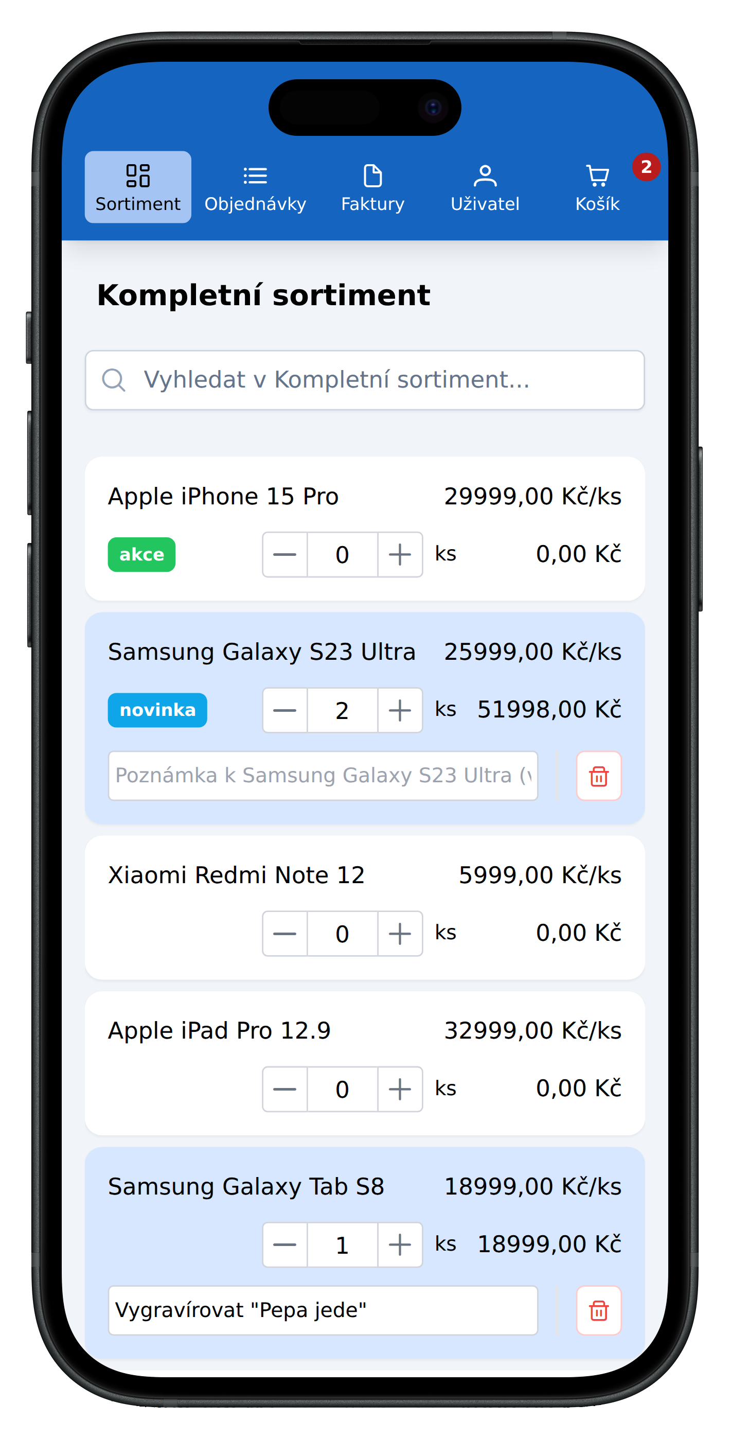 Vaši zákazníci (obchodní partneři) získají přístup do online mobilního eshopu / objednávkového systému, kde si mohou sami pohodlně objednávat zboží z vašeho sortimentu.